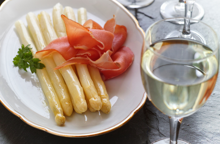 バターソースやホランデーズをかけて、生ハムと茹でたジャガイモといただくのが一般的です。レストランでは5月から6月中旬頃、特別メニューとしてよく出されます。