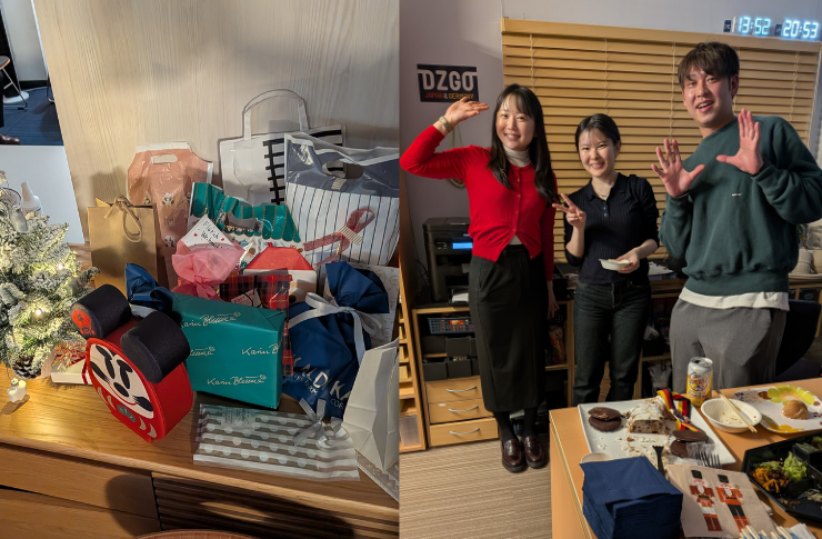 小さくても、とても素敵。最初のプレゼントをツリーの下に並べた時は、こんな感じでした。その後のプレゼント交換では、テーブルがプレゼントで埋め尽くされるほど!プレゼントを配る時は笑い声が溢れていて、みんな大満足の様子でした。来年もまたDZGOでプレゼント交換ができたら嬉しいです!